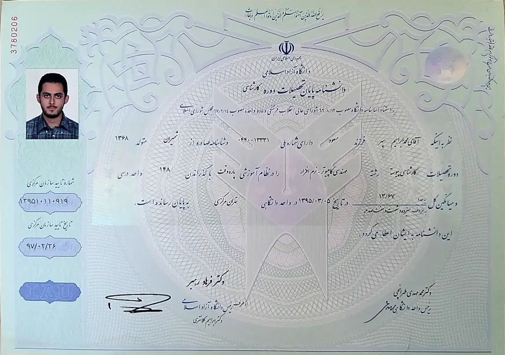 Bachelor of Science in Computer Software Engineering. Azad University, Central Tehran Branch, Iran - 2016